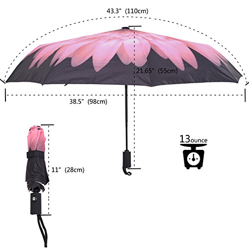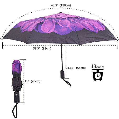 -. Feature : FAST AUTO OPEN AND CLOSE: Don't Wait Another Second To Open The Umbrella When You Get Out From Your Car In The Rains, Especially Heavy Rains. It Is Easy To Open and Close. / STRONG WINDPROOF, STURDY AND DURABLE: 100% Nylon, Strong and Durable Fiberglass Black Ribs And Shaft and The Non-slip Foam Rubber Handle. DURABLE AND COMFORTABLE. It Can Protect You From Rain and UV Rays. / COMFORTABLE AND PORTABLE: Size: Opening Diameter:38.5",Opening Arc:43.3", Opening Length:21.65", Closed Length:11", and The Weight:13ounces. This Small Umbrella Folded Is Easy To Be Put in A Backpack, Case Or Tote. / BEAUTIFUL PACKAGE AND GREAT UMBRELLA FOR WOMEN: Beautifully Packaged Umbrella Is The Best Gifts To Your Friends and Families. Beautiful Flowers Are The Best Choice For Women. / BEST GUARANTEE: If You Found Any Problem, Please Contact Us; If You found You Do Not Like it, Just Return It, And We'll Refund You.