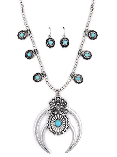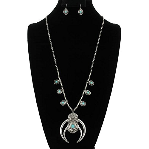 -. Feature : Squash Blossom Long Necklace Set. / Metal / stone/ bead/ Costume Jewelry / Squash Blossom Size: 3"L x 2.7"W / Silver plated Lobster Claw Closure / Silver & Turquoise Color 30''