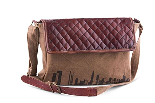-. Feature : Mona B Skyline Messenger Bag / Trim : Genuine leather, antique metal hardware / Eco-friendly fashion that provides a one-of-a-kind style / Material: 100% repurposed tarp materials, genuine leather, ticking stripe lining / Size : 12" W x 8.5" H x 3" D, 20" Adj. Strap