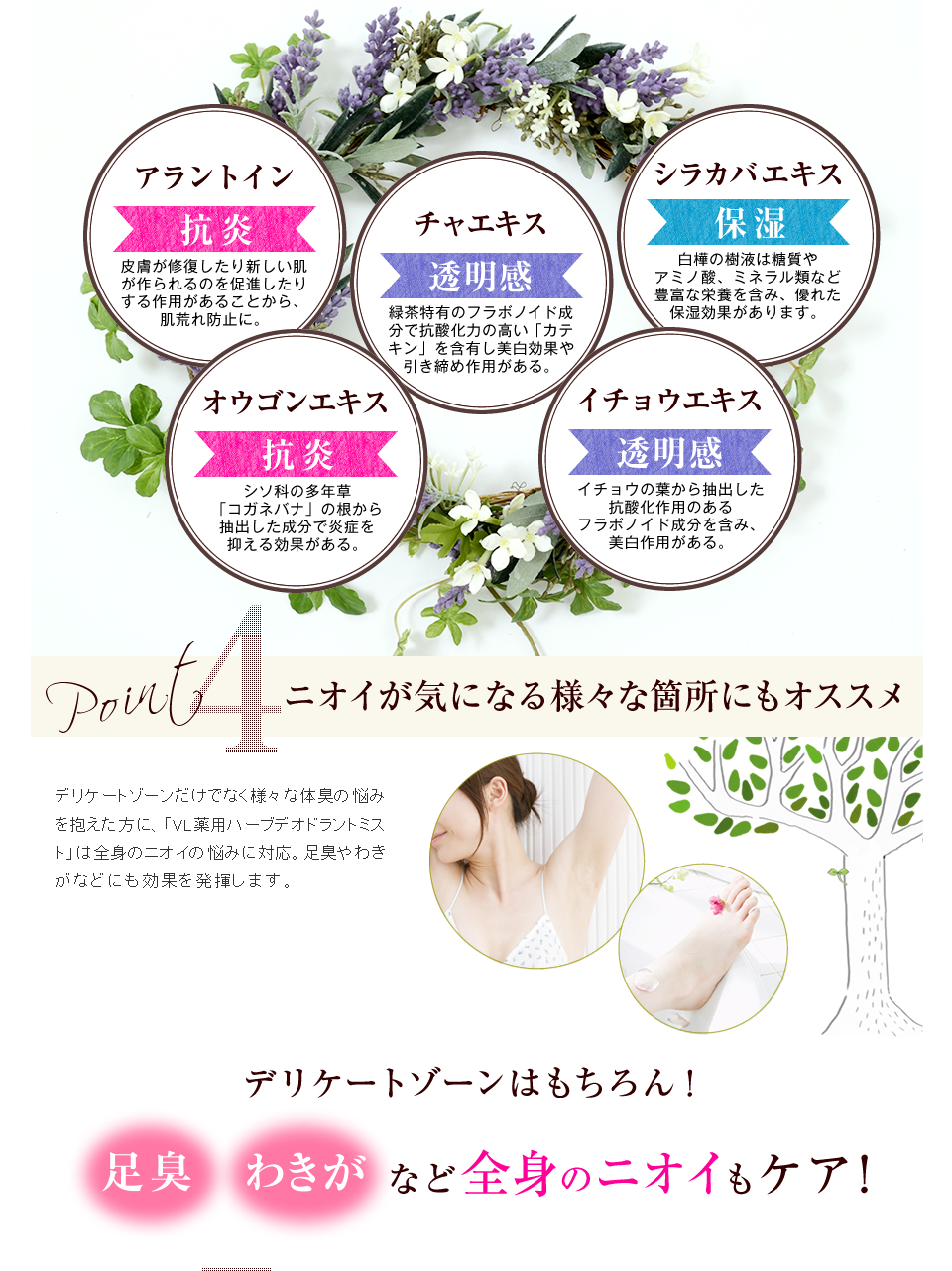 精製水、エタノール、1,3-ブチレングリコール、アラントイン、オウゴンエキス、カンゾウ抽出末、イチョウエキス、チャエキス(1)、シラカバエキス、チャ乾溜液、香料、ポリオキシエチレンポリオキシプロピレンブチルエーテル、ポリオキシエチレン硬化ヒマシ油、無水エタノール、クエン酸ナトリウム、クエン酸、フェノキシエタノール |