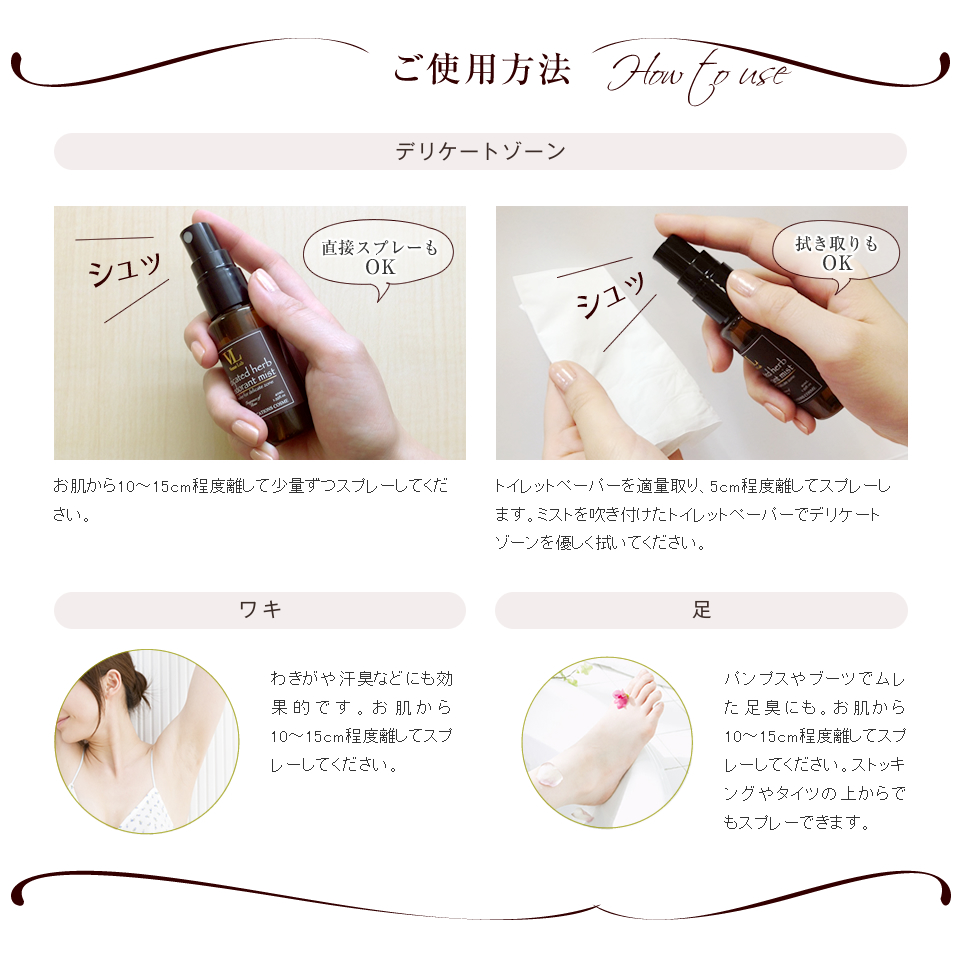 お肌から10~15cm程度離して少量ずつスプレーしてください。 1回の使用目安は2~3プッシュです。 |