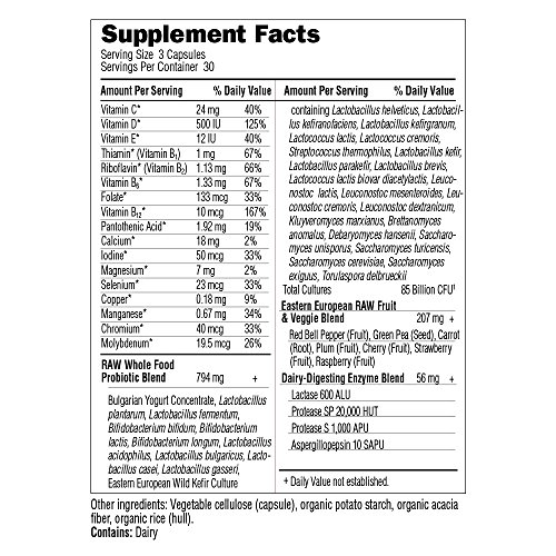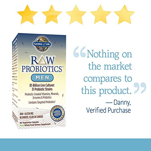 Garden of Life RAW Probiotics Men is a RAW, full spectrum, whole food probiotic formula specifically designed to meet the unique needs of men. RAW Probiotics Men offers 31 original probiotics, including L.fermentum, specifically formulated for men to support immunity during exercise and physical exertion. RAW Probiotics Men also delivers probiotic-created vitamins, minerals, and prebiotics as well as dairy-digesting enzymes to help break down lactose and casein. RAW Probiotics Men goes Beyond Probiotics offering a broad range of benefits specifically targeted for men. RAW means our probiotics are uncooked, untreated, unadulterated; with no binders or fillers and no carriers such as maltodextrin or dextrose. What you see on the label is what you get in the bottle—temperature-controlled cold storage and delivery from the moment the probiotic cultures are harvested until you swallow your first capsule—ensures that your probiotics Arrive Alive!Feature
