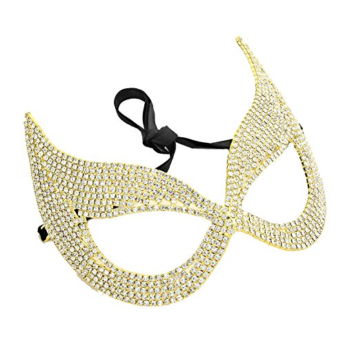 -. Binding : Apparel -. Brand : Ginga's Galleria -. Color : Gold -. Department : womens -. EAN : 0649906672777 -. Feature : Crystal rhinestone masquerade masks are made with eco-friendly metal alloy / Color - Gold / Clear / 7" Width X 6" Height / It can be used for a wedding party, a masquerade party, ball, prom, or many different occasions. / These Masks are secured with two ribbon ties for easy wear. -. ProductGroup : Apparel -. ProductTypeName : ACCESSORY -. Size : Adjustable -. Title : Ginga's Galleria 41288 Cat Eye Crystal Rhinestone Masquerade Mask - Gold / Clear -. UPC : 649906672777