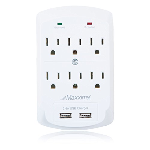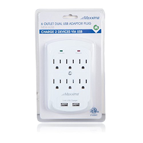 Maxxima 6 Outlet Dual USB Grounded Adaptor Plug 2.4A Charger Port 300 Joules Surge Protector