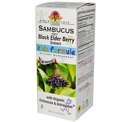 Sambucus nigra L. is the latin name for Black Elder. The dark blue/black berries of this plant have many naturally-occurring nutritional substances such as Rutin, Quercetin (flavonoids) and Anthocyanins. Current research supports the long held beliefs about Elderberry's health benefits on the body. Elderberry syrup has been traditionally used to help support the immune system, especially during the winter season or when experiencing extra stress. Sambucus Kids Formula combines black elderberry with organic echinacea and organic astragalus for gentle enhanced immune support. Organic Agave Nectar insures a pleasing, smooth taste, with no artificial ingredients. Free Of Artificial sweeteners, preservatives and alcohol. Disclaimer These statements have not been evaluated by the FDA. These products are not intended to diagnose, treat, cure, or prevent any disease.(Note: This Product Description Is Informational Only. Always Check The Actual Product Label In Your Possession For The Most Accurate Ingredient Information Before Use. For Any Health Or Dietary Related Matter Always Consult Your Doctor Before Use.) Ingredients: Nature's Answer Sambucus nigra Black Elder Berry Extract Kids Formula Directions As a dietary supplement take one (1) teaspoon 3-4 times a day in a small amount of water. Shake well before use. Supplement Facts Serving Size: 1 Teaspoon Servings Per Container: 24 | Amt Per Serving | % Daily Value | | | Black Elder Berry Extract | 1862 mg | * | | Proprietary Herbal Blend (Echinacea Purpurea 0 | |