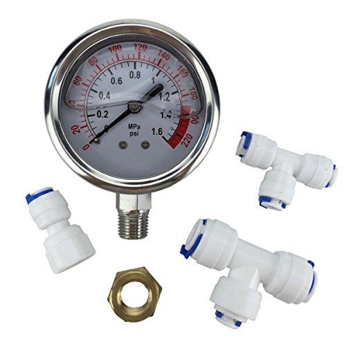 Pressure gauge for use with reverse osmosis systems, aquarium discuss marine systems and all water filter systems. Using a pressure gauge with your reverse osmosis system can be a great addition to your system as most problems that occur with reverse osmosis systems can relate to your water pressure. Pressure Gauge Pack
