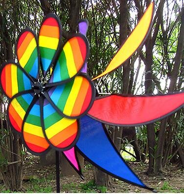 Rainbow 8-Petal with Wind Sail Directional Pinwheel with Wind Vane is made with rainbow colored durable polyester fabric that is stain, UV and weather resistant.