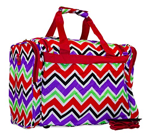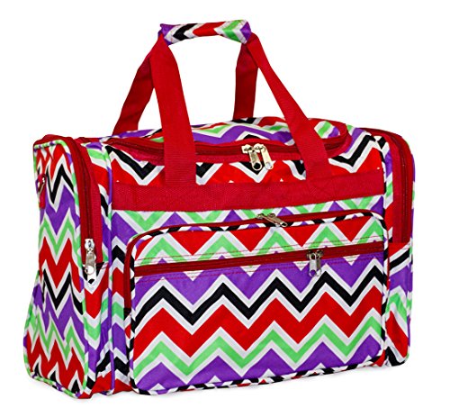 -. Brand : World Traveler -. ClothingSize : One Size -. Color : Red -. Department : womens -. EAN : 0701622194503 -. Feature : Adjustable, detachable non-slip padded shoulder strap / U-top opening provides easy access to roomy zipper secured main compartment / Metal feet allows stabiity to bag when setting down and provides bag floor not to touch floor directly to get dirty / Front exterior zip pocket with two exterior end slit pockets / Silver pewter hardware -. Model : T19-170 -. MPN : T19-170 -. PackageQuantity : 1 -. PartNumber : T19-170 -. ProductGroup : Apparel -. ProductTypeName : LAGE -. Size : One Size -. Title : World Traveler Red Multicolor Zig Zag Chevron Print Duffle Bag 19-Inch -. UPC : 701622194503