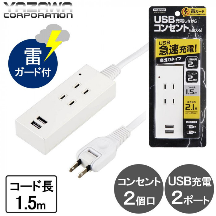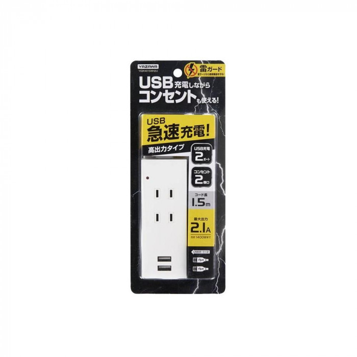 | 仕様 | コンセント口数:2口(合計1400Wまで) USBポート:2ポート(最大出力2.1A) 最大サージ電圧:6000V 絶縁カバー付きプラグ(耐トラッキング仕様) プラグ形状:スイングプラグ コード長:1.5m |