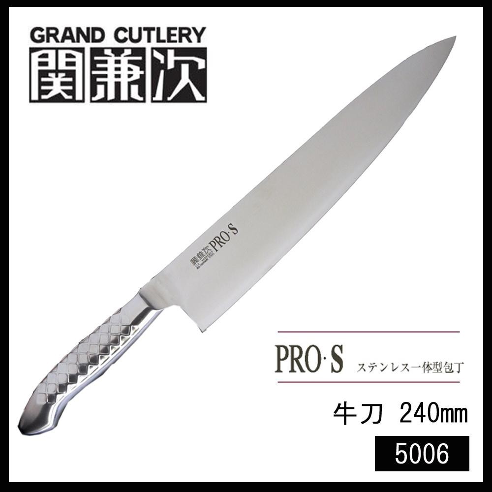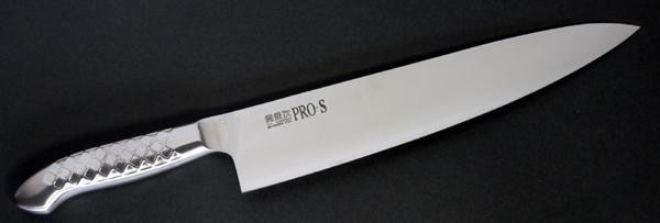 PRO・Sシリーズの牛刀は、家庭からプロまで広く愛用される包丁です。人間工学に基づいたデザインで、長時間の使用にも疲れにくい、丸みのある人に優しいフォルムが特徴。刃からハンドルにかけて、流れるようなラインを生み出し、一体感のある形に仕上がっています。ステンレス一体型は、日本刀の模様のイメージのスリットが滑り止めの役割を果たします。 |