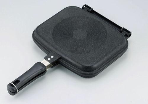 | 両面使うことができ、取り外しも簡単なので別々に使うこともできます。外せば角型フライパン・グリルプレートとしてお使いいただけます。内部で熱気が対流するので、食材全体を加熱でき余分な脂はフチの凹みに溜まってとってもヘルシーです。 |