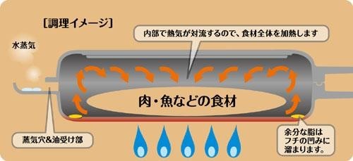 両面使うことができ、取り外しも簡単なので別々に使うこともできます。外せば角型フライパン・グリルプレートとしてお使いいただけます。内部で熱気が対流するので、食材全体を加熱でき余分な脂はフチの凹みに溜まってとってもヘルシーです。 |