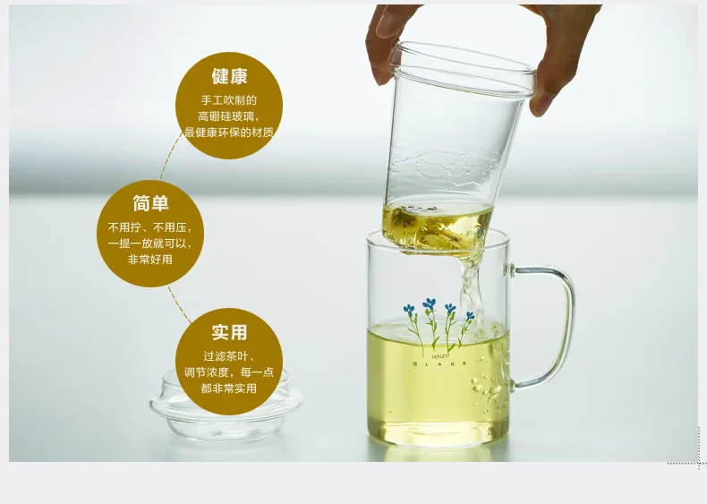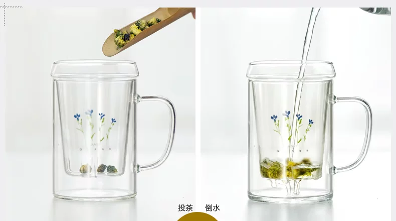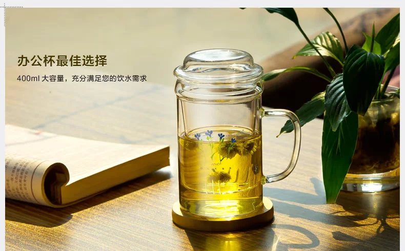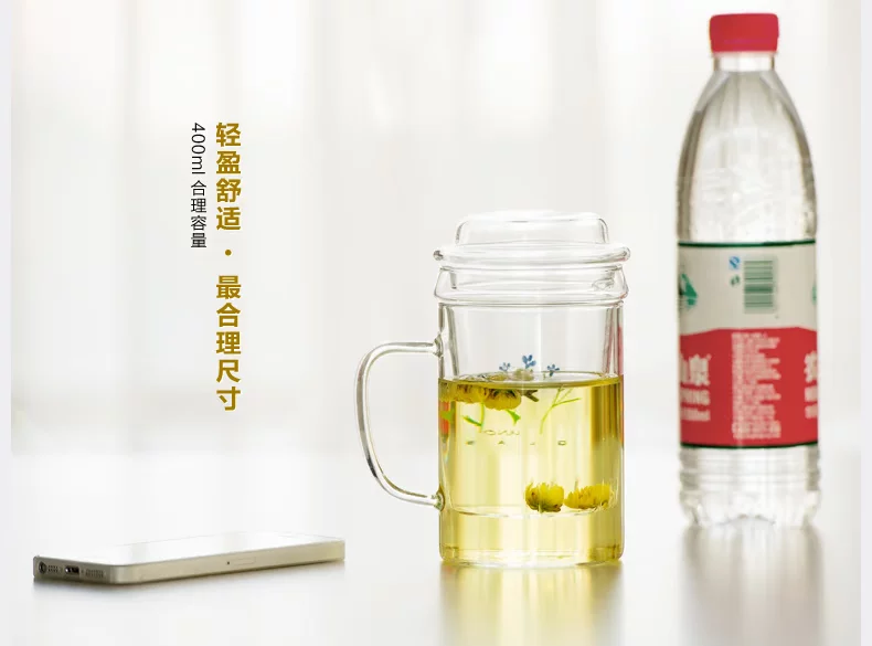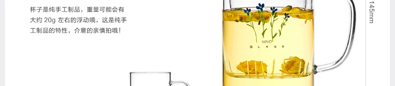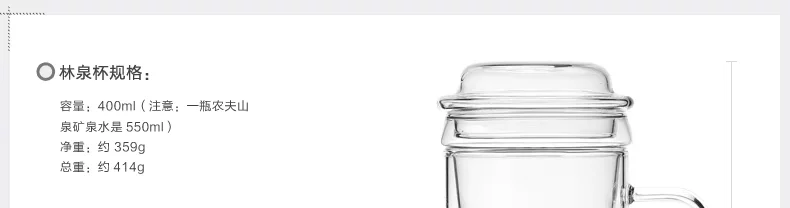 | 这款林泉花茶杯为高硼硅手工吹制,轻盈剔透,大约可以装400ml的水,比一瓶矿泉水稍微少一点。使用时舒适趁手,一点不笨重哦。 |