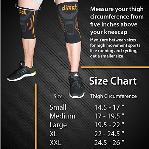 -. Feature : BE CAPABLE OF MORE: Suitable for all sports activities that involve stress on your joints. Dimok Knee Braces are here to help! Durable compression fabric Nylon 80%, Spandex 20%. Order yours today! / BE PAIN FREE: Joint pain relief sleeves for running, cycling, basketball, baseball, volleyball, martial arts, crossfit, work outs or any fitness activities. Dimok sleeves are ideal for low or high impact exercises enabling you to minimize stress on your knees & recover quickly. / SIZING INFO: Dimok knee compression sleeves ensure they fit just right and do not slip down your leg while exercising due to non-slip banding. 5 sizes (Small - XXL). Please see size chart. / BE COMFORTABLE: Good lift and rise knee support with no stiffness, no itching. Wear Dimok Leg Protector light and soft material all day with full mobility and comfort. Unisex. / SATISFACTION GAURANTEE - if you are not happy with the purchase, you are welcome to return it for a full refund.