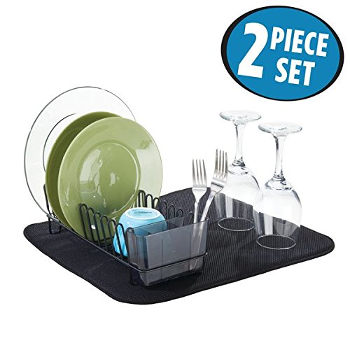 mDesign Compact Kitchen Dish Drainer Rack and Drying Mat for Drying Glasses, Silverware, Bowls, Plates - Matte Black/Smoke, Black/White