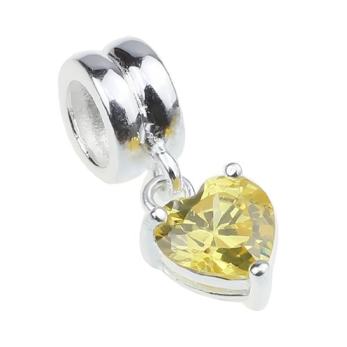 STERLING SILVER HEART DANGLE EUOPEAN BEAD/CHARM/PENDANT WITH LEMON YELLOW CZ STONES FIT PANDORA BIAGI CHAMILIA AND TROLLBEADS CHAIN BRACELET NECKLACE.DC008