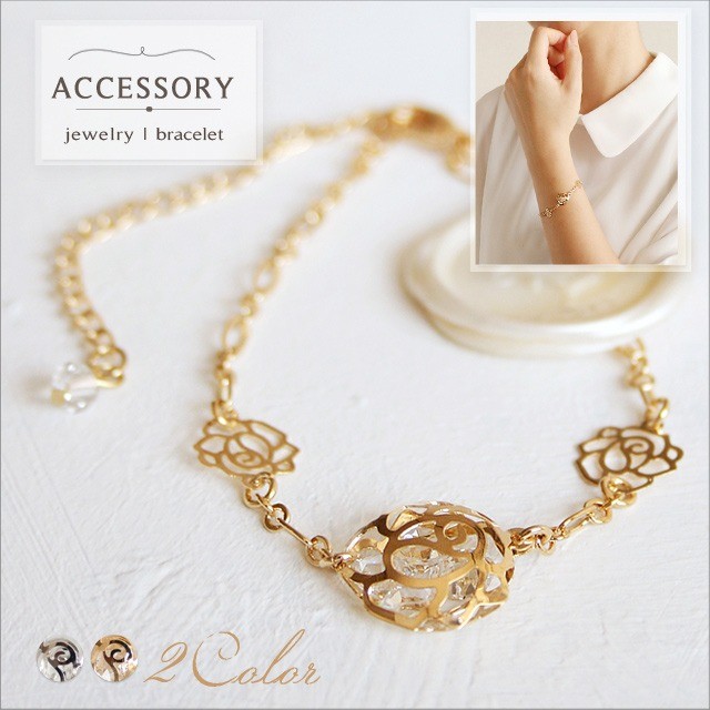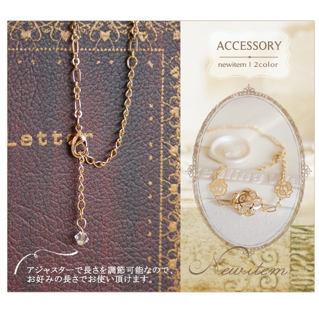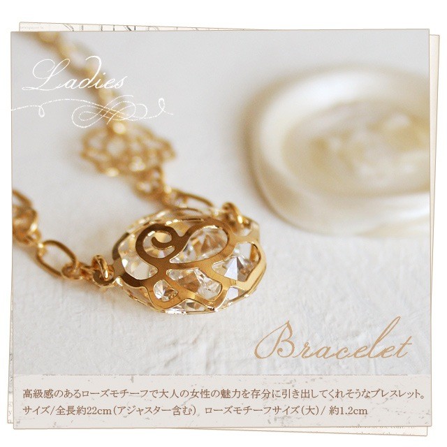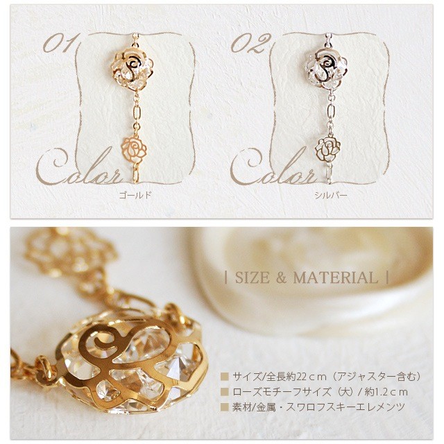 素材:金属、スワロフスキーエレメンツサイズ:約22cm(アジャスター含む)ローズモチーフ(大):約1.2cm