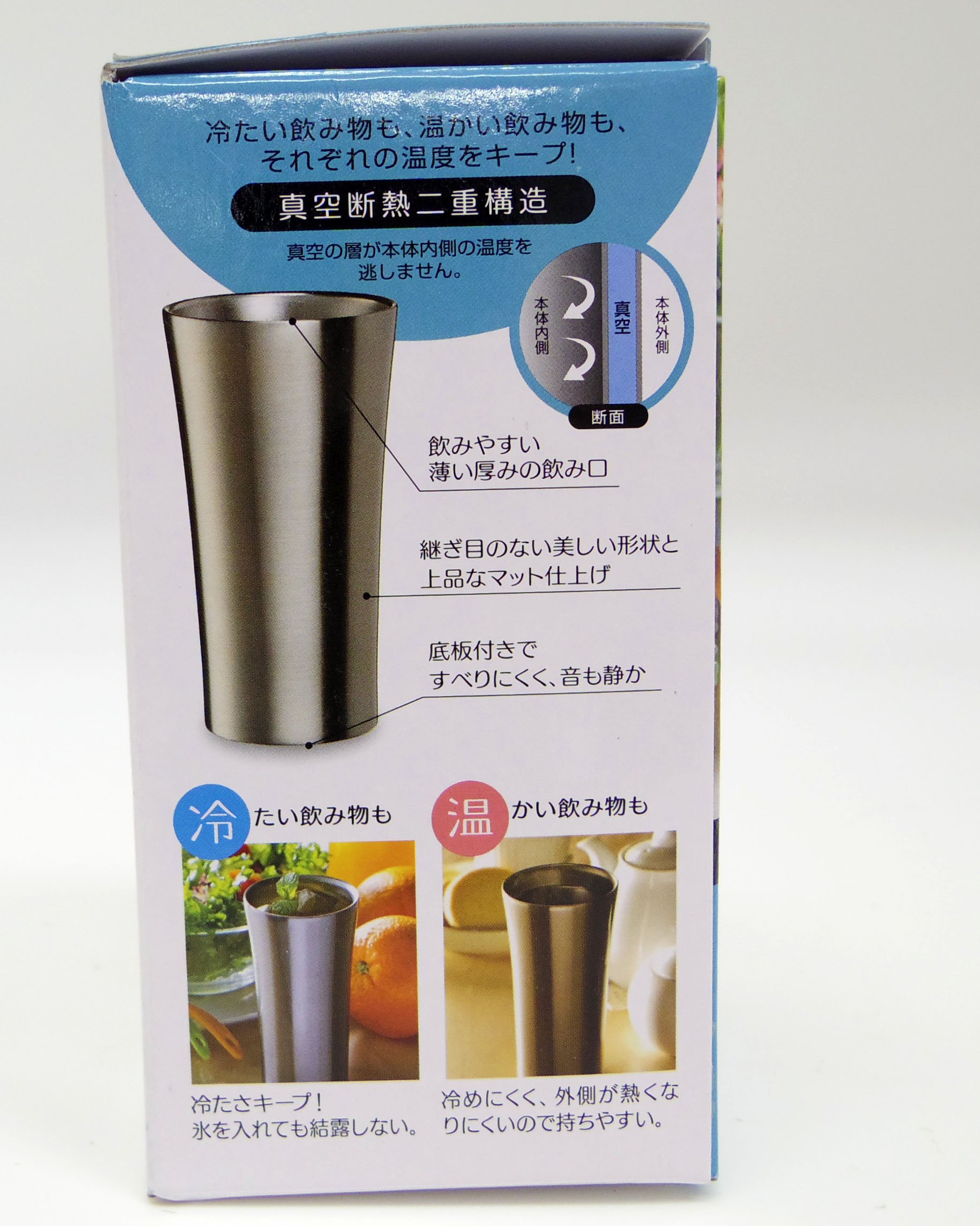 ● Dumb structure tumbler that does not have water drops around even if you put a cold drink.