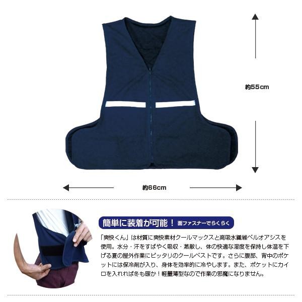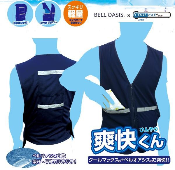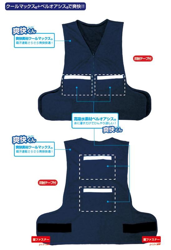 | 爽快素材のクールマックスと超吸水素材のベルオアシス、さらに保冷剤を4個装着しており、トリプルで身体全体を効果的に冷却します。反射テープがついており、夜間もご使用頂けます。サイドの面ファスナーでサイズ調整が簡単にできます。 |