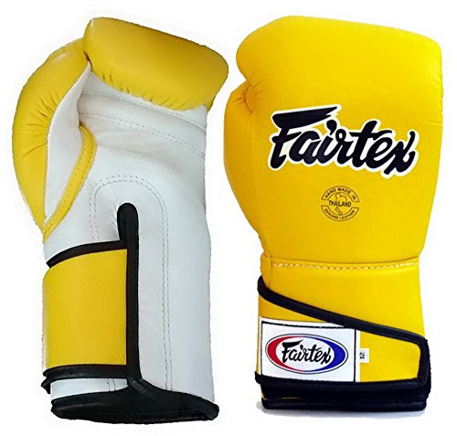 -. Binding : Misc. -. Brand : Bangplee_Sport -. Color : Yellow White Black -. Feature : Engineered with the triple-layered foam system around the knuckle hitting area for maximum shock absorption and protection. / Ergonomically contoured hand compartment and curved thumb design for optimal fist closure to minimize the wrist muscle tensions. / Locked-thumb design to minimize eyes and thumb injuries. -. IsAutographed : 0 -. IsMemorabilia : 0 -. Label : Fairtex -. Manufacturer : Fairtex -. ProductGroup : Sports -. ProductTypeName : SPORTING_GOODS -. Publisher : Fairtex -. Size : 14 oz -. Studio : Fairtex -. Title : Fairtex BGV6 Yellow White Black Color - Stylish Angular Sparring Gloves - Locked Thumb for Muay Thai Kick Boxing MMA K1