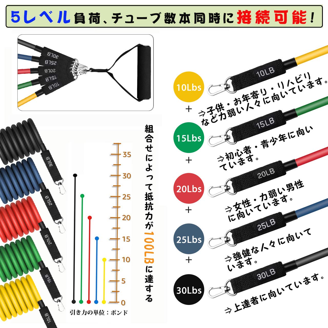 🎽【5段階負荷調整&チューブカバー付き】抵抗力強度:💛黄:約5Kg、💚緑:約7Kg、💘赤:約9Kg、💙青:約11Kg、❤黒:約14Kg。色により分かれて、使いやすいです。彩りの健康生活ができます。🎁抵抗バンド5本、泡ハンドル2本、アンクルストラップ2本、ドアアンカ1個、チューブカバー1個、締め紐ポーチ1個、トレーニングガイドとユーザーマニュアル1冊が付属しております。このような豊富の付属品を利用して、多様なトレーニング効果を実現できます。