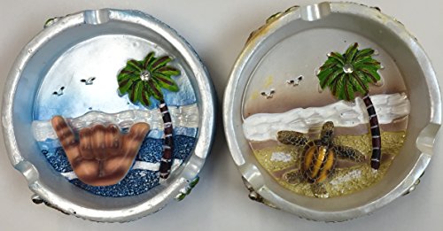 -. Feature : Porcelain Ashtray Hang Loose and Turtle Hawaiian design / Turtle, Palm Tree, & Ocean Design. P.R.Ice set of 2 pcs / Color: Blue, multi-colored. Approximate Size: 3.5 inches (diameter) / Name marked same as picture. Very nice cut design / Check out "TIKI PRODUCTS" at the top of the page for more souvenirs!