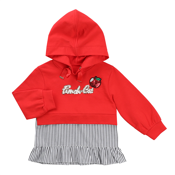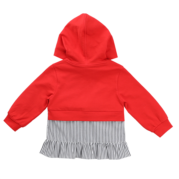 상품설명 레드컬러의 후드가 달린 롱티셔츠입니다. 후드옆에 장식스트링과 포인트 자수가 멋스러우며, 밑단에 스트라이프 배색 프릴이 러블리함을 더했습니다. 롱기장으로 레깅스등과 코디하셔도 좋으며, 데님팬츠와도 잘어울립니다.