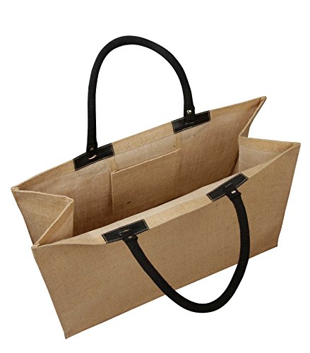 Large Laminated Jute Bag with Leather Accents and Interior Pocket 21"W x 14"H x 9" Bottom Gusset- CarryGreen Bag