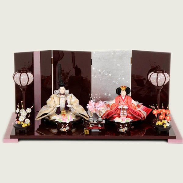 ・台座・屏風等には落ち着いた色目の雛人形セット。