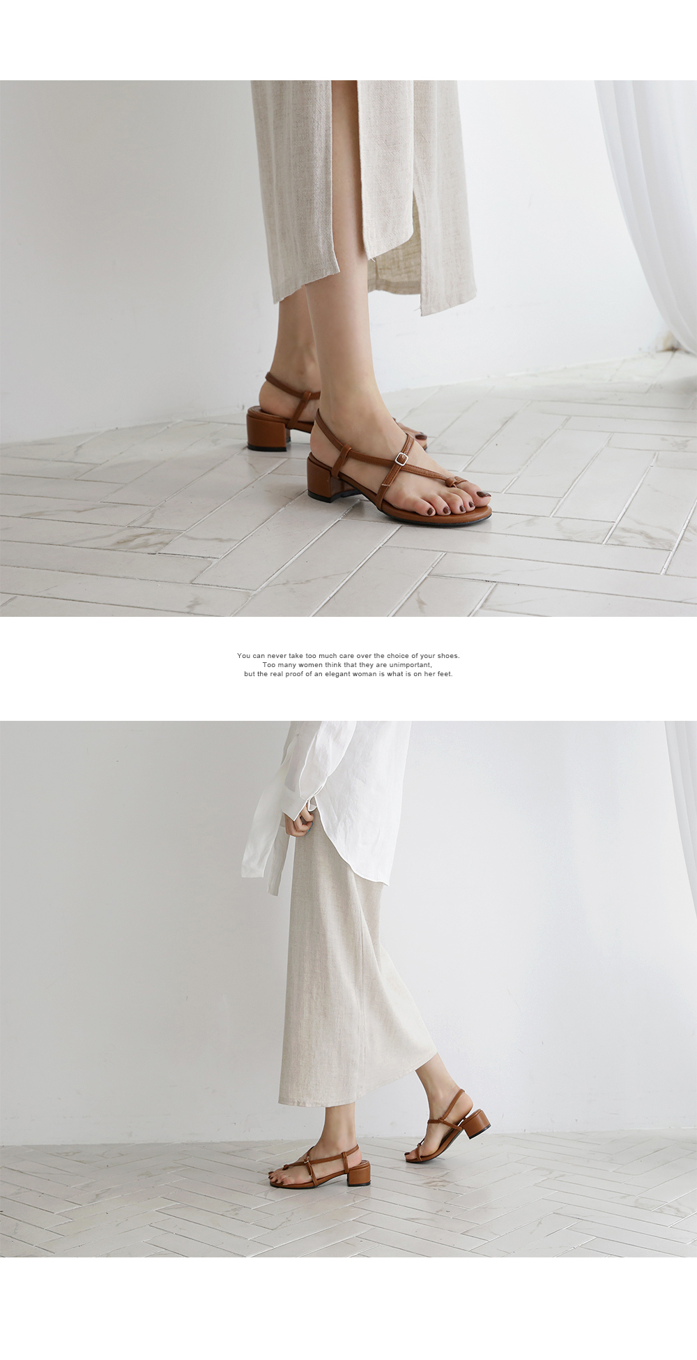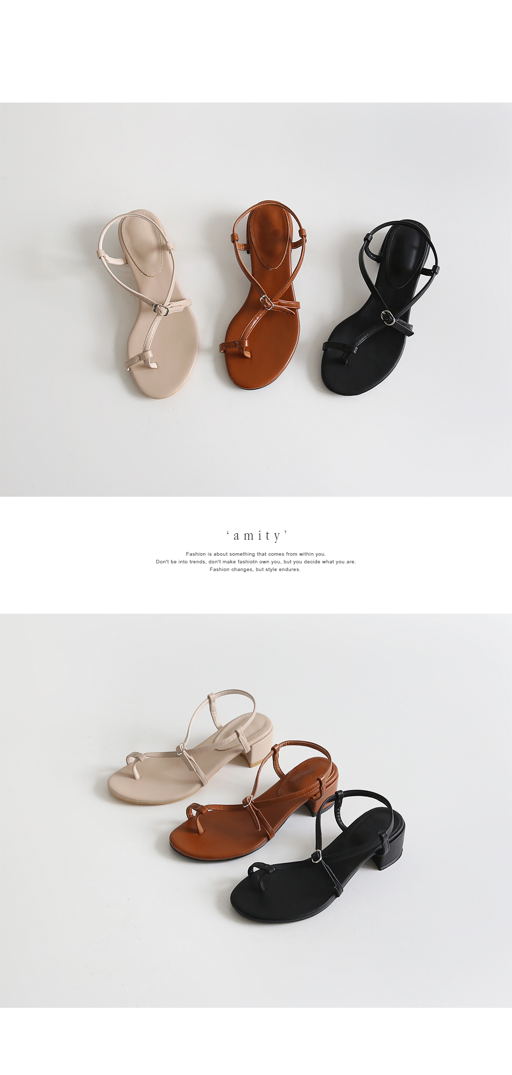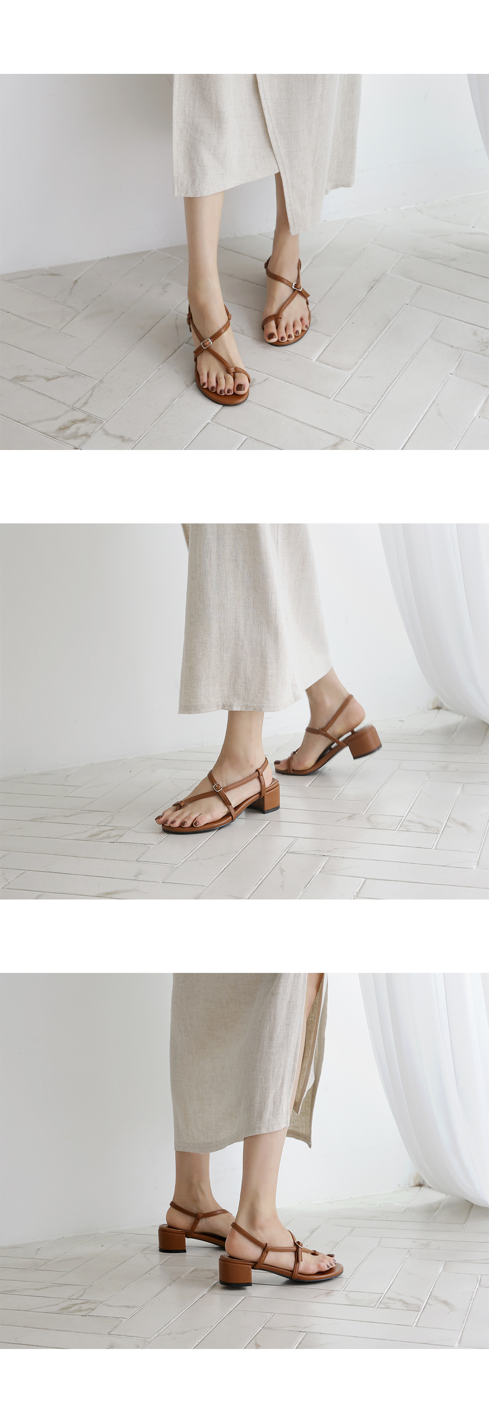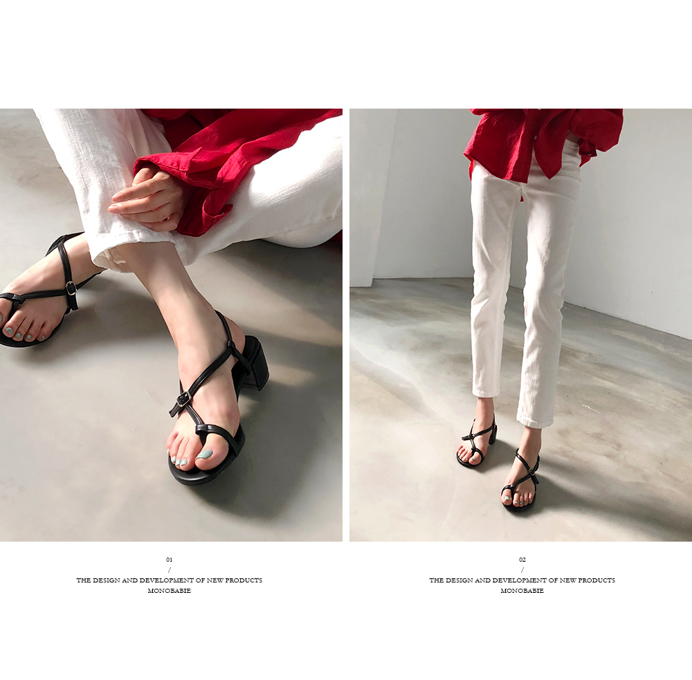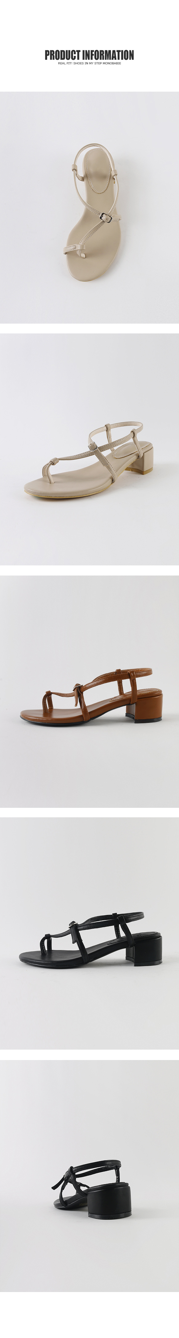 한 번 꼬여있는 스트랩과 볼드한 굽은 착화 시 발을 안정적이게 잡아줍니다.