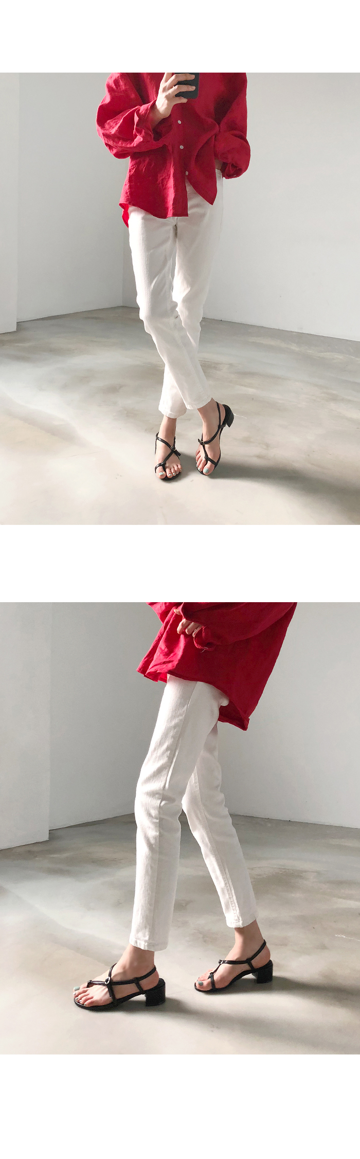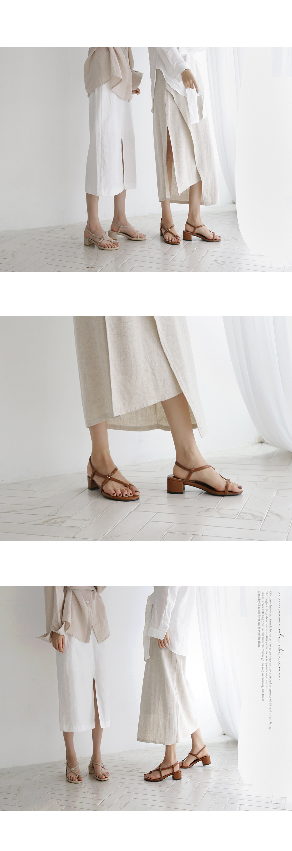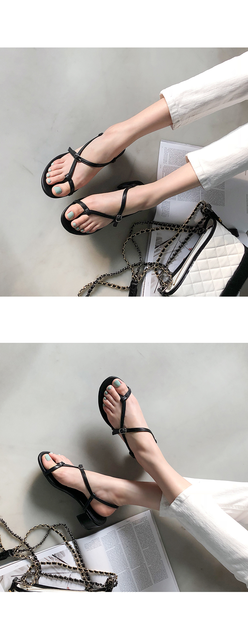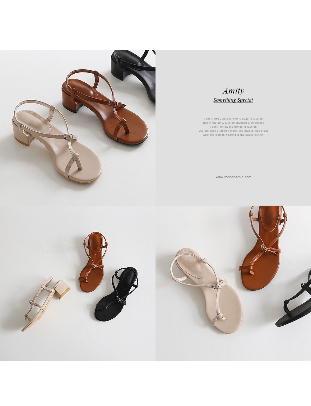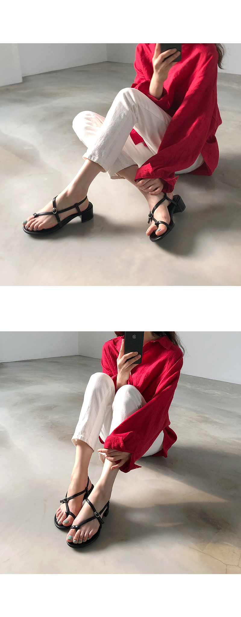 한 번 꼬여있는 스트랩과 볼드한 굽은 착화 시 발을 안정적이게 잡아줍니다.