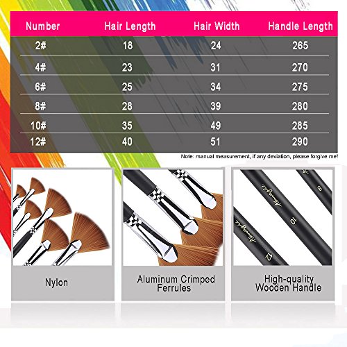 - ☛ MEETS ALL PURPOSE PAINTING NEEDS: Set of 6 brushes in various sizes, including size 2#,4#,6#,8#,10#,12#. Our fan brushes are suitable for painting leaves, grassland with watercolor tubes, perfect for nail art or face painting with acrylic paints, and they are suitable for drafting, crushing or drawing straight line in big oil painting project.