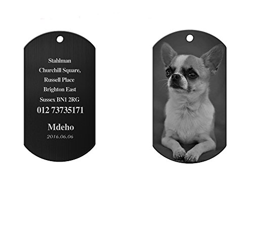 Premium stainless steel pet identification tags. Strong, durable, and long lasting pet id tags for your small, medium, and large pet dogscats. With 2 sided engraving up to 50 characters maximum personalized text, there's plenty of room for all of the important information such as pet name, address, telephone number or photo image - up to 1 photo can be engraved. Free engraving.