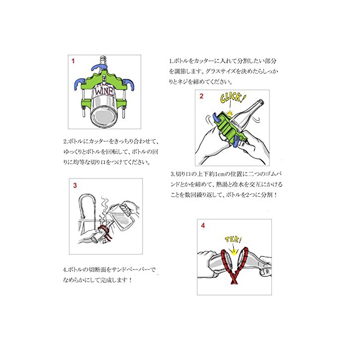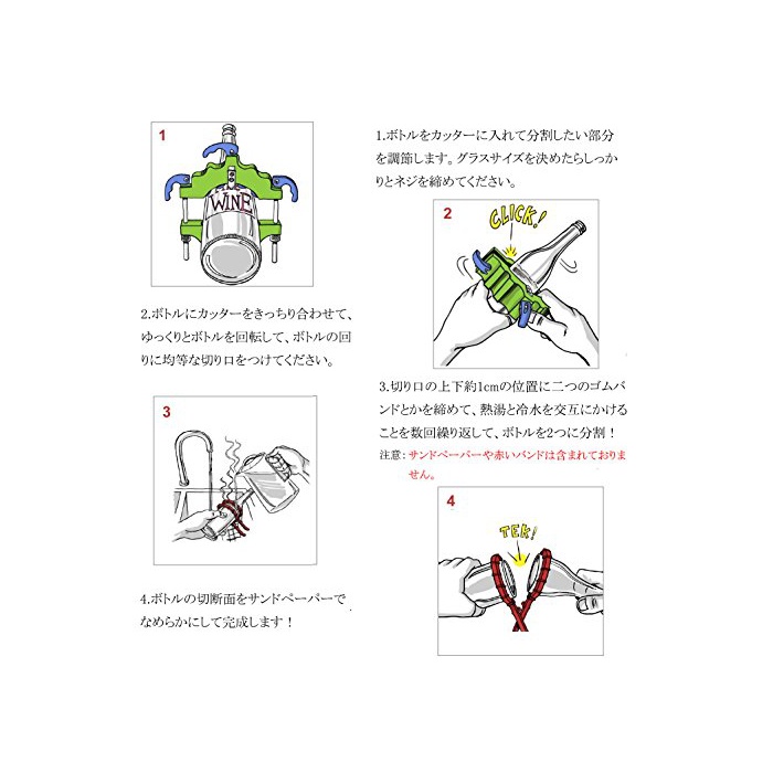 【사용 방법】와인 보틀을 분할 하고 싶은 부분에 커터를 조절.천천히 보틀을 회전시키고, 단면의 라인이 희미하게 볼 수 있으면,열탕과 냉수를 번갈아 거는(걸치는) 것을 몇차례 반복해,라인을 기점에 ## 넘기이라고 분할!누구라도 손쉽고 간단하게 완성으로 옵니다!