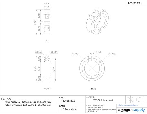 Climax Metal 1C-112-S T303 Stainless Steel One-Piece Clamping Collar, 1-1/8" Bore Size, 1-7/8" OD, With 1/4-28 x 3/4 Set Screw