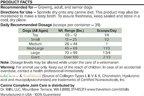 -. Feature : Dr. Bill's Canine Complete Joint Care contains MSM and other essential antioxidants that can significantly reduce the discomfort associated with arthritis, chronic pain, and inflammation. / Recommended for support and maintenance of healthy hip and joint function / Using biologically-approP.R.Iate, high-quality, natural ingredients such as Methyl Sulfonyl Methane (MSM), Tumeric, Green Lipped Mussel Extract, Collagen Type I, II, V, X, Omega 3,and hyaluronic acid / Used by veterinarians nationwide for over 30 years. / Made in USA
