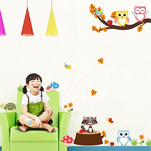 -. Title : Witkey Cartoon Colorful Forest Animal Monkey Owls Bear Deer Yellow Flower Tree Nursery Wall Stickers Decals Murals Vinyl Removable Art Wall Decals for Kids Children Home Decoration