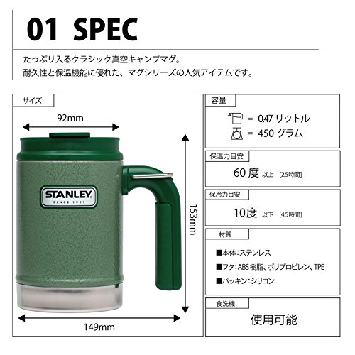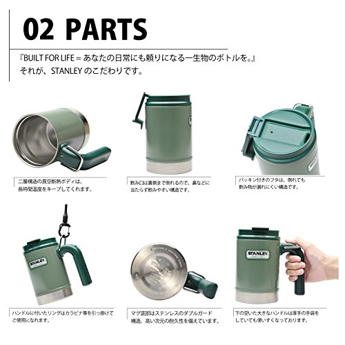 Stanley classic 16oz hammertoe green vacuum camp mug is durable, rugged, and reliable. Vacuum insulations keeps coffee hot 2.5 Hours, cold 4.5 Hours, and iced 20 hours. Stainless steel won't rust and is naturally BPA-free. The flip lid is leak resistant and dishwasher safe. Integrated d-ring clips to packs.Feature