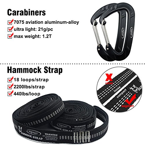 ✔ULTRA LIGHT CARABINERS -- Durable 7075 aviation aluminum-alloy. Ultra light: 21g(0.75 oz) per carabiner. But it's very sturdy and safe, rated to withstand over 2500 pounds (12 KN) of force per carabiner. It meets the highest climbing safety standards. 100% safe guarantee for hanging camping Hammock.