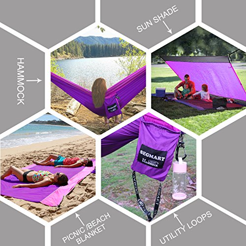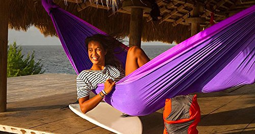 ✔ATTENTION: DOUBLE HAMMOCKS HAVE UPGRADED on Oct. 23th -- The black ropes of the ends of hammocks have been upgraded to grey nylon slings. It's stronger and much more portable, which bears 550Ibs/sling. The new upgraded hammock can be used as sunshade, camping/beach blanket, swing chair, warm blanket etc. All gears are in one bag. Capacity:400-600lbs, size:118"x78". Best hammock for family camping.