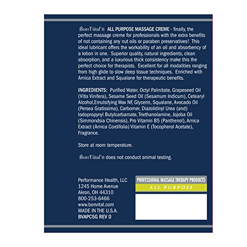 ReleaseDate : 2017-03-12 Studio : TheraBand Publisher : TheraBand Binding : Misc. Product Description Bon Vital, the #1 preferred brand of massage therapists focusing on professional quality products, provides you with the perfect cremes to give a relaxing massage of all modalities and techniques. These cremes give the perfect foundation to heal tired, sore heal muscles while leaving skin soft and conditioned and can be combined with any Bon Vital essential oils to create the ultimate aromatherapy massage experience. 0