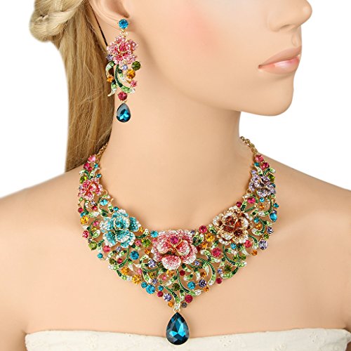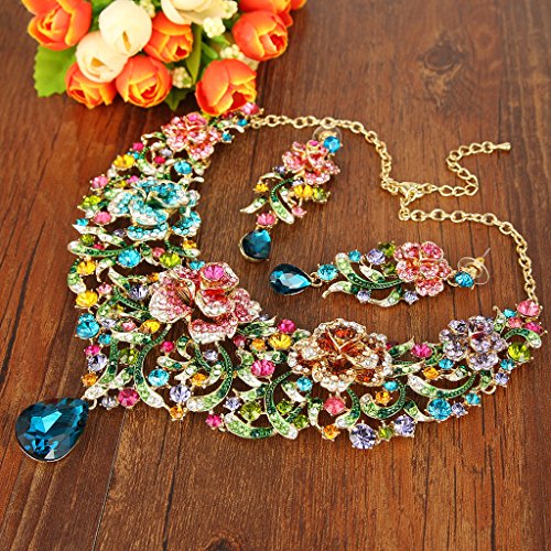 -. Title : EVER FAITH® Gold-Tone Austrian Crystal SP.R.Ing Rose Flower Vine Tear Drop Jewelry Set Multicolor