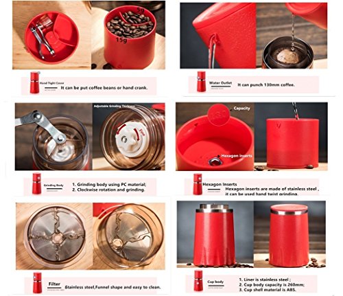 ALL-IN-ONE - Beans storage, Drip Kettle, Hand Mill Grinder, Reusable Filter Dripper, Mug cup, etc. Adjust the grinding thickness according to your needs, brew a variety of delicious coffee. All you need to provide is your favorite coffee beans and boiling water or milk, sugar. Everything you need is to make a great cup of coffee used with your favorite brewing method. It is also a nice coffee cup as travels or gifts.