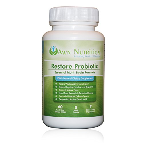 -. Feature : SUPERIOR EFFECTIVENESS COMPARABLE TO 100 BILLION CFU - Awn Nutrition Patented Controlled Release Delivery System ensures that significantly higher percentage of live probiotics reach the gut flora, where they can provide maximum health benefits versus other forms of probiotic capsules, Other forms of probiotics that have not been developed using this patented technology won't even pass through the harsh stomach environment in order to colonize in the GI tract / REPLENISH GUT BACTERIA AND DETOXIFY YOUR BODY - Restore balance to your body's delicate microbiome, restore weakened immune system, boost energy levels, increase digestive function, restore regularity and finally erase that constant feeling of upset stomach and excessive bloating, Try our Awn Nutrition probiotics today to meet your new healthier you / PROBIOTICS WITH PREBIOTICS - Formulated with the most essential probiotic strains, Combining probiotics with prebiotics in each daily tablet ensures that the beneficial bacteria stay healthy and flourish in your gut, this supplement is the ultimate probiotic to promote healthy digestion and immune support, It's perfect for men and women who suffer from food poisoning, digestive issues, yeast infections, occasional cramping, gas, diarrhea, constipation, who have been on a heavy use of antibiotics / FEEL THE ADVANTAGE - Each probiotic tablet uses time release delivery system which allows for once daily dosing and still reach your GI tract, This means that the benefits of taking a single probiotic tablet will be delivered and felt throughout the whole day without upsetting your stomach, Each tablet is programmed to release probiotics over eight to ten hour time frame / 100% NATURAL GLUTEN FREE VEGETARIAN SAFE DAILY DIETARY SUPPLEMENT - Awn Nutrition Restore Probiotic is Non-GMO and lactose-free, It is a 100% natural probiotic that also does not contain soy, wheat, nuts, corn, sugar, artificial colors and flavors