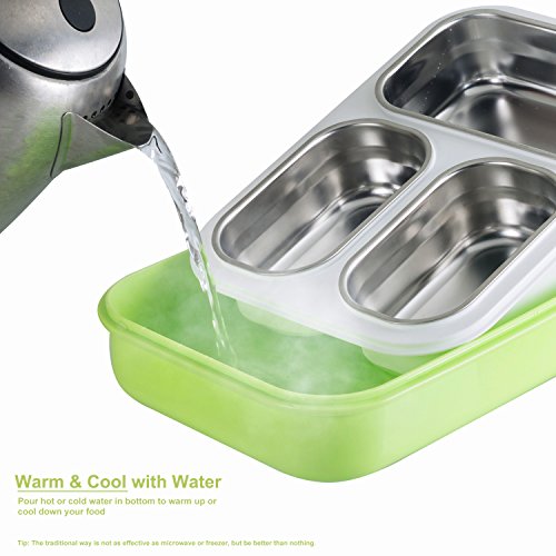 【WARM & COOL WITH WATER】The innovative bento box provides an secondary convenient option to warm up or cool down your food with water when out of microwave or freezer. Just split the two bases, pour water in the bottom.