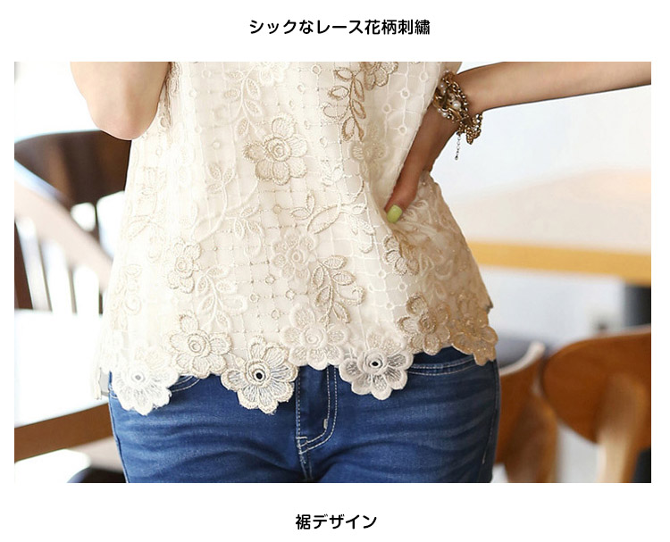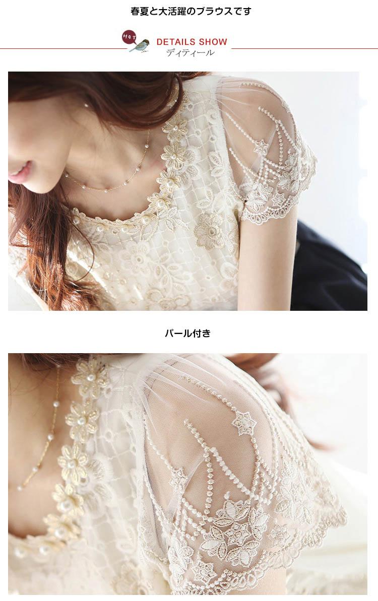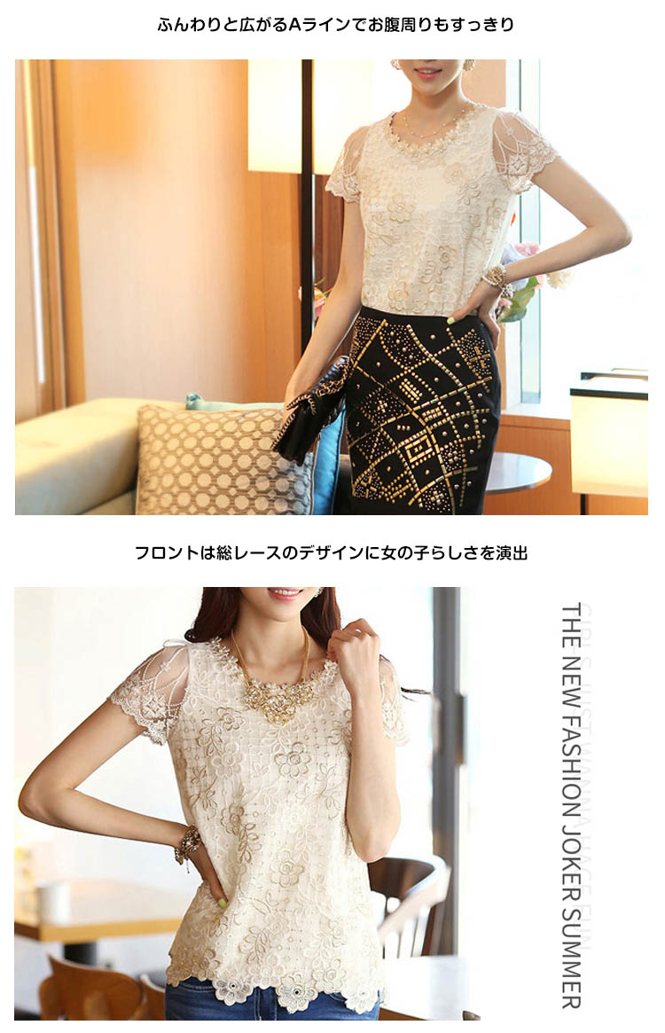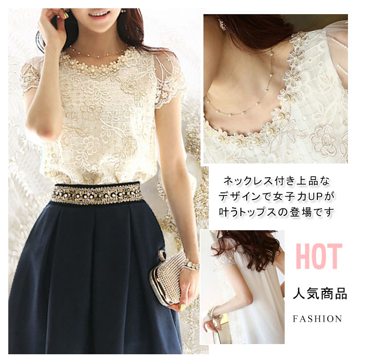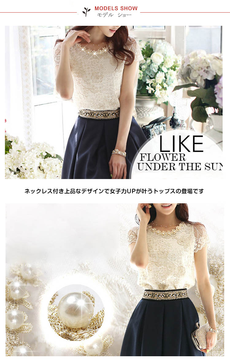 | ネックレス付き上品なデザインで女子力UPが叶うトップスの登場ですふんわりと広がるAラインでお腹周りもすっきりフロントは総レースのデザインに女の子らしさを演出春夏と大活躍のブラウスです | |