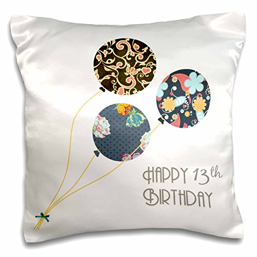3dRose Happy 13th Birthday - Modern Stylish Floral Balloons. Elegant black Brown Blue 13 Year Old Bday - pillow Case, 16 by 16-Inch (pc_161954_1)