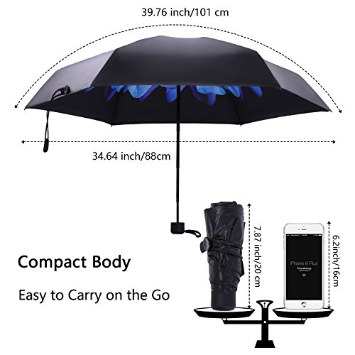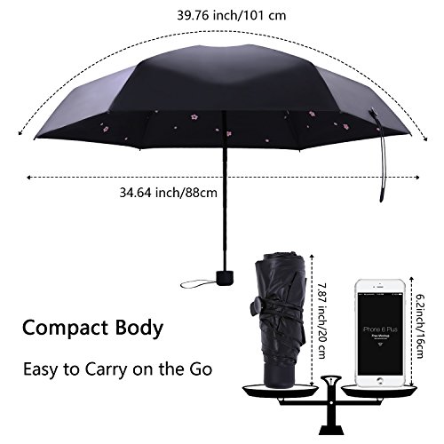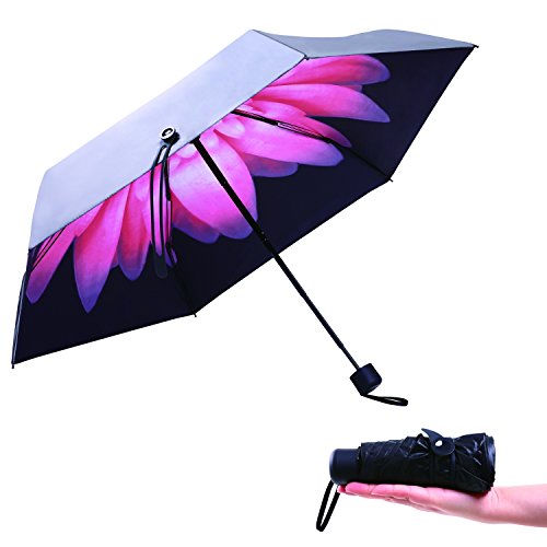 -. Feature : ☂Ultra Light:Flexible fiberglass and 6-rib of aluminum alloy design make the whole umbrella weigh about 7.2 oz. Protecting you from the sun and rain every day, you almost don't feel its existence at the same time / ☂Ultra Mini:Small & slim when folding but normal size canopy when open which fits one person.Any one of your purses can easily hold it,You can even put it in your pocket if you like / ☂Ultra Protective:There is high-tech Nano Polymer Compound in the outermost coating layer, the layer prevents 95% of the UV. Excellent heat insulation effect each you comfortable and safe traveling in hot weather / ☂Ultra Stylish: It is so easy to open and close the umbrella with the unique elastic silicone belt. Frosted rubberized handle brings you a lasting sense of comfortable grip. No-button design protects your fingers from being injured / ☂Ultra Protable:Have so cute compact ultra-light mini umbrella,Whether traveling or shopping,You can carry it, can protect your hot and sunny days,Make you happy for a day