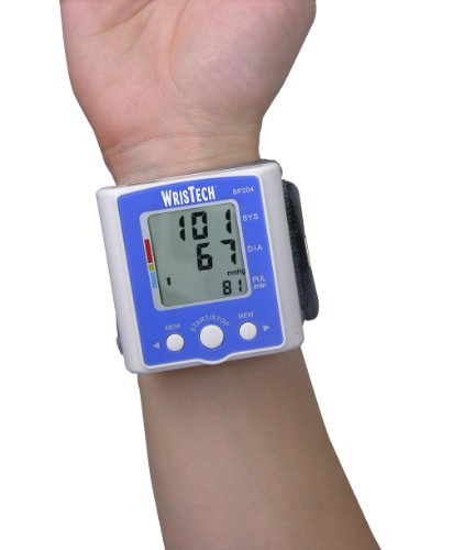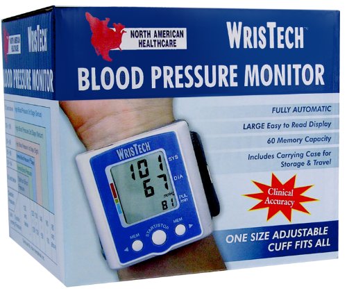 -. Brand : North American Healthcare -. EAN : 0682017301747 -. Feature : Fully automatic; Large easy to read display; Clinical accuracy / Uses 2 "AAA" batteries (not included); Comes complete with carrying case / Measurement Method: Oscillometric; Display: Liquid Crystal Digital Display; / Measurement Range: Pressure: 0~299 mmHg Pulse: 40~180 beats/minute; Accuracy: Pressure: within (+-) 3 mmHg Pulse: within (+-) 5% / Memory: Stores up to 60 measurements; Automatic Power Off: About 2 minutes after measurement is completed -. ProductGroup : Health and Beauty -. ProductTypeName : PERSONAL_CARE_APPLIANCE -. Title : Wrist Blood Pressure Monitor Digital Blood Pressure Monitor One Size Fits All Adjustable Cuff -. UPC : 682017301747