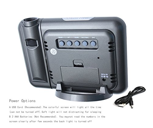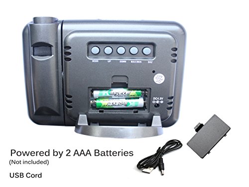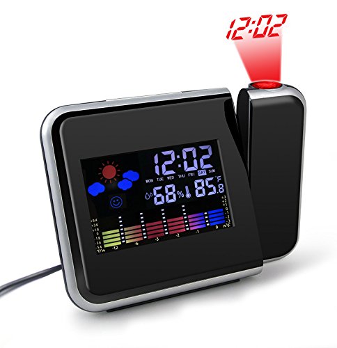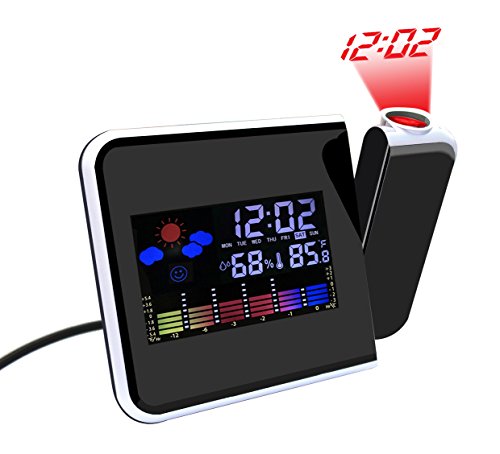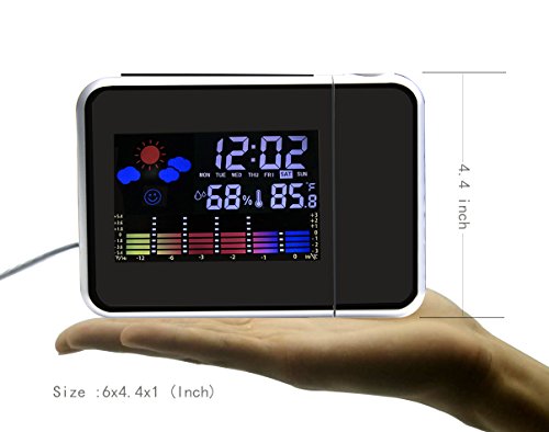 Specification: 1.Calendar Range: 2000-2099 DC 2.Temperature Range: -10 ~ 60°C( 14.2 ~ 140 °F ) 3.Humidity Range: 20%~99% 4.12-hour temperature trend curve 5.Several weather forecast: sunny, cloudy, rainy. 6.Query the history of MAX and MIN, update the temperature and humidity automatically. Package content: 1 X Digital Alarm Clock 1 X USB Charging Cable 1 X User Manual Note: 1 When you use battery, backlight and projection can last up to 8 seconds. When you put in the outlet,backlight and projection can stay on 24hrs everyday. 2 Adjust the best angle projection in the wall before you sleep. 3 If any problems/Concerns about the clock or setting, feel free to contact us. 0